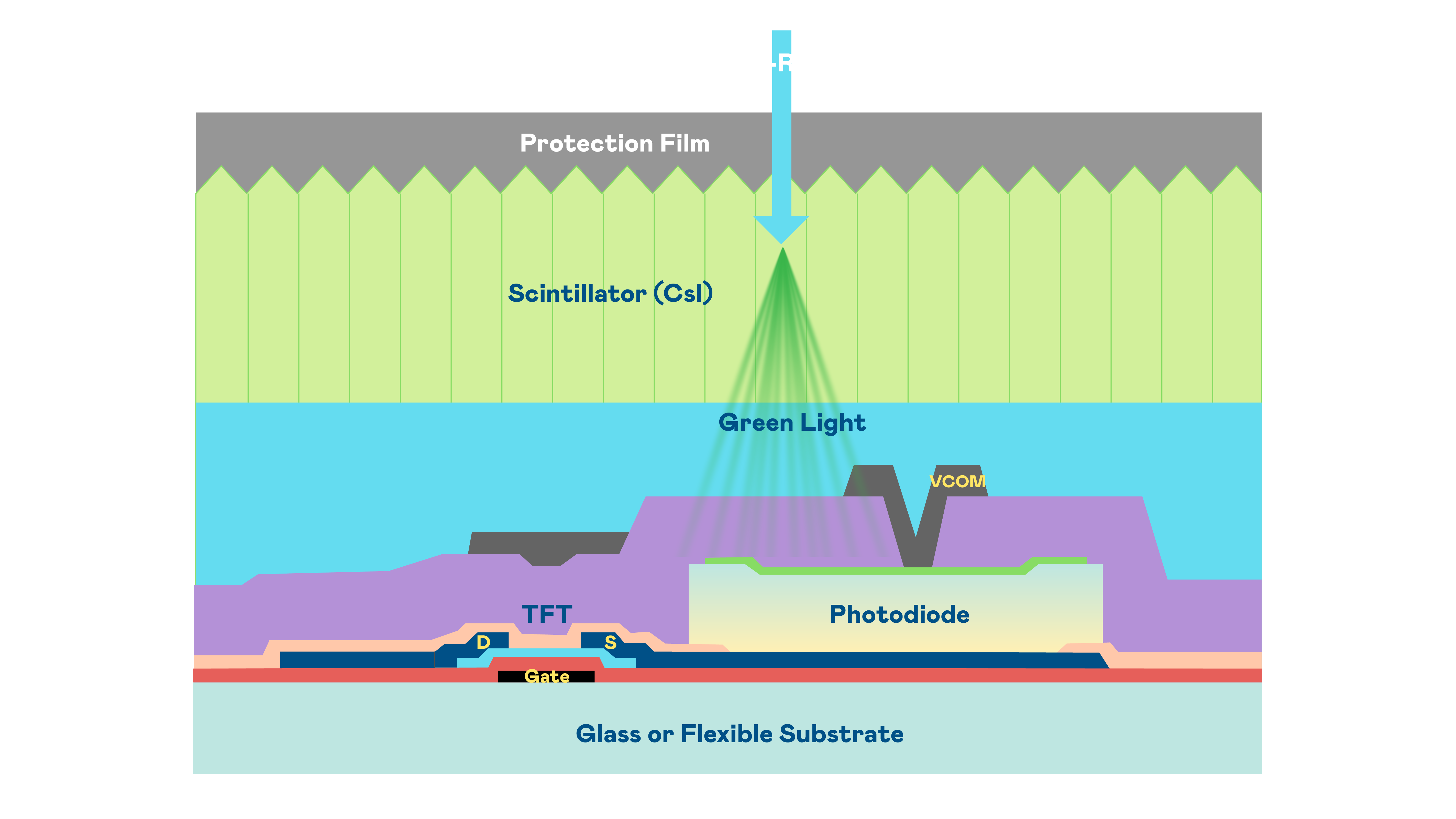 3522vip浦京集团的X光影像感测阵列使用薄膜电晶体 (TFT) 作为每个像素的读取开关,搭配光电二极体(Photodiode)的光电转换元件,用以感测X光影像讯号。